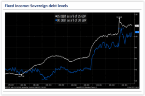 But gilts are far riskier now than they were in the 1970s. The chart below, courtesy of Bloomberg, shows the debt to GDP ratio of the UK (and US) dating back 50 years. When the UK sought an emergency loan (of “just” $3.9 billion) from the IMF in 1976, its debt to GDP ratio stood at roughly 40%. Today it is significantly more than twice that.
